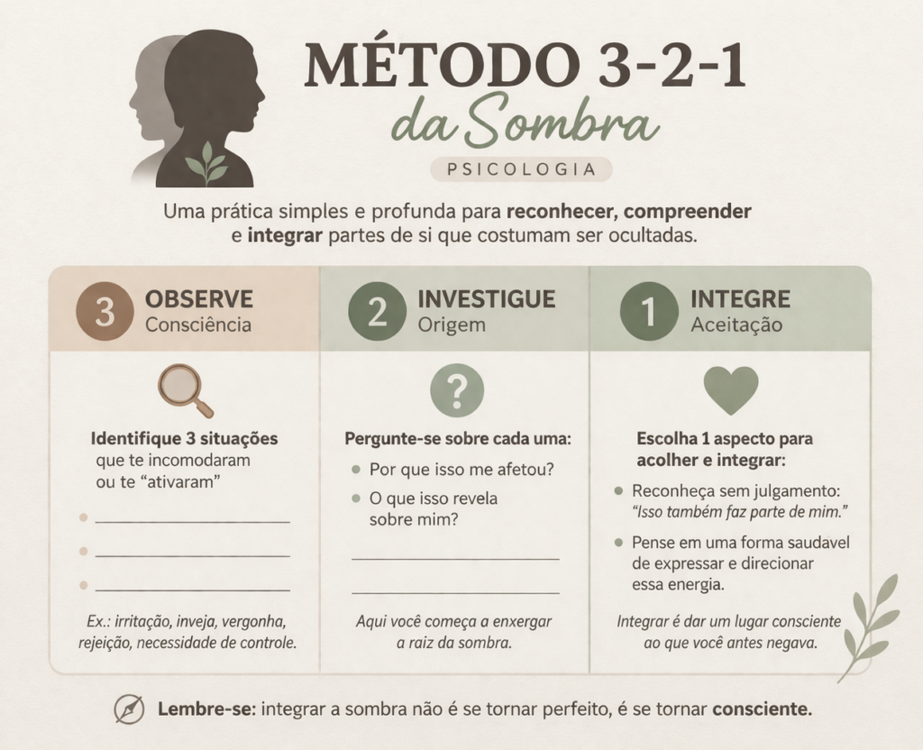 O “3-2-1 da sombra” na psicologia é uma forma prática de: observar → entender → integrar partes ocultas de si mesmo